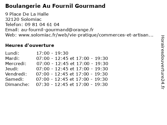 1 Au Fournil Gourmand (Distance: 14,09 km) 26 Rue du 8 Mai 1945, 32380 Saint-Clar au, baguettes, boulangerie, fournil, gourmand, pâtisserie, restauration, viennoiserie 2 Boulangerie Pâtisserie Cazeneuve (Distance: 19,47 km) 4 Rue Alexandre Laffont, 32500 Fleurance alimentation, baguette, boulangerie, cazeneuve, commerce, fleurance, gâteaux, pain, pâtisserie 3 Boulangerie Banette (Distance: 19,99 km) 11 Grande Rue, 32270 Aubiet banette, boulangerie, maison, patisserie 4 Hôtel-Restaurant au Canard Gourmand (Le Restaurant) (Distance: 35,48 km) - La Rente, 32130 Samatan au, bar, canard, diner, déjeuner, et, gourmand, hotel, hôtel, le, logis, restaurant, réunions, évenements 5 Hôtel-Restaurant au Canard Gourmand (Distance: 35,48 km) - La Rente, 32130 Samatan au, bar, canard, gourmand, hotel, hôtel, logis, restaurant, réunions, évenements 6 Le Fournil De Blagnac (Distance: 42,79 km) 26 Place De Catalogne, 31700 Blagnac abelanet, alain, blagnac, fournil, restaurants |