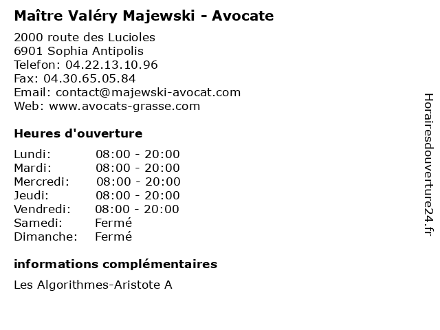 1 Fabienne Majewski - Sage-femme (Distance: 7,63 km) 15 avenue des Broussailles, 06400 Cannes consultation, docteur, dr, fabienne, femme, majewski, med, médecin, sage, traitement 2 Maître Cédric Palazzetti - Avocat (Distance: 0,00 km) 2000 route des Lucioles, 06410 Biot avocat, avocate, avocats, civils, cédric, droits, juridiques, maître, palazzetti 3 Maître Eric Elarbd - Avocat (Distance: 0,69 km) 30/100 rue Albert Caquot, 06410 Biot avocat, avocats, civils, droits, elarbd, eric, juridiques, maître 4 Maître Lucille Romestin - Avocate (Distance: 0,69 km) 30/100 rue Albert Caquot, 06410 Biot avocate, avocats, civils, droits, juridiques, lucille, maître, romestin 5 Maître Julien Tamagno - Avocat (Distance: 0,69 km) 100 rue Albert Caquot, 06410 Biot avocat, avocate, avocats, civils, droits, julien, juridiques, maître, tamagno 6 Maître Xavier Le Cerf - Avocat (Distance: 0,69 km) 100 rue Albert Caquot, 06410 Sophia–Antipolis avocat, avocats, cerf, civils, droits, juridiques, le, maître, xavier |