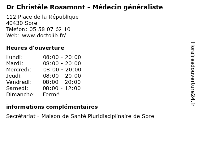 1 Dr Loïc Portal - Médecin généraliste (Distance: 0,00 km) 112 Place de la République, 40430 Sore de, docteur, dr, generaliste, généraliste, loïc, maison, medical, médecin, pluridisciplinaire, portal, santé, soin, sore 2 Dr Marie-Pierre Lauga-Clercq - Médecin généraliste (Distance: 24,37 km) 103 Route de Sabres, 40420 Labrit clercq, de, docteur, dr, generaliste, généraliste, labrit, lauga, maison, marie, medical, médecin, pierre, pluridisciplinaire, santé, soin 3 Dr Emilie Morton - Médecin généraliste (Distance: 24,37 km) 103 Route de Sabres, 40420 Labrit de, docteur, dr, emilie, generaliste, généraliste, labrit, maison, medical, morton, médecin, pluridisciplinaire, santé, soin 4 Maître Christèle Badets-Pean - Avocate (Distance: 37,10 km) 93 Cours de Lattre de Tassigny, 33210 Langon avocate, avocats, badets, christèle, civils, droits, juridiques, maître, pean 5 Dr Christèle Bisson - Médecin généraliste (Distance: 43,33 km) 21 bis Route de Casteljaloux, 33690 Grignols bisson, christele, christèle, docteur, dr, generaliste, généraliste, medical, médecin, soin 6 CECIB (Distance: 52,52 km) 10 Esplanade des Antilles, 33607 Pessac canadiennes, cecib, centre, communautés autochtones, d'etudes, histoire, interuniversitaire, recherche pluridisciplinaire, religions |