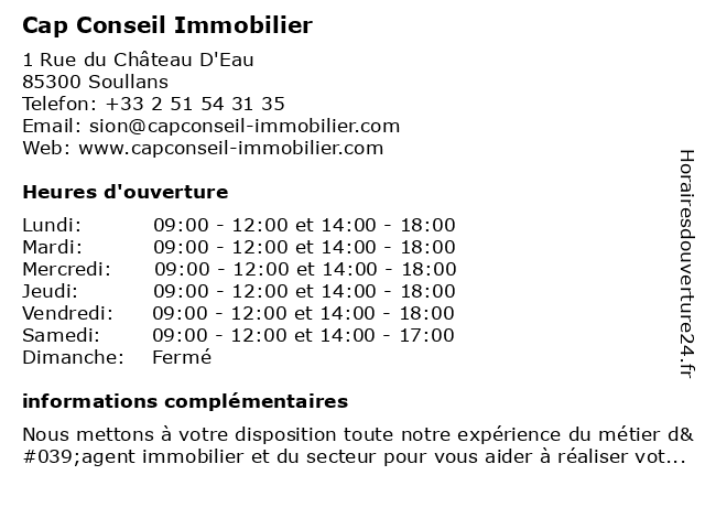 1 Cap Conseil Immobilier (Distance: 0,01 km) 1 Rue du Château d'Eau, 85300 Soullans agence, cap, conseil, gestion, immobilier, location, transactions, vente 2 Pharmacie Cap Océan (Distance: 4,16 km) 72 Rue des Sables, 85300 Challans cap, magasin de cosmétiques, océan, pharmacie, santé et beauté, shopping. 3 Cap Rando (Distance: 4,75 km) 130 Rue Pauline Lézardière, 85300 Challans cap, loisirs, magasin d'articles de sport, magasin de vêtements., rando, sports 4 Espace Conseil France Rénov' (Distance: 4,88 km) 1 Boulevard Lucien Dodin, 85300 Challans administration, communes, conseil, espace, france, rénov', service, services publics 6 Résidence La Cap'Line - EPHAD (Distance: 7,76 km) 17 bis Place de la Mairie, 85300 Le Perrier cap'line, ephad, la, maison, retraite, résidence, vendée |