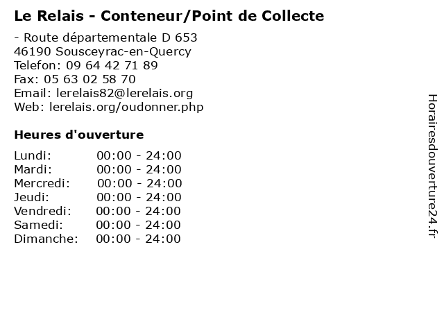 1 Le Relais - Conteneur/Point de Collecte (Distance: 0,00 km) - Zone d'aménagement concerté de la Joie, 46190 Sousceyrac-en-Quercy collecte, conteneur/point, de, dons, le, point, relais, vêtements 2 Le Relais - Conteneur/Point de Collecte (Distance: 6,67 km) - Route départementale D673, 46500 Rocamadour collecte, conteneur/point, de, dons, le, point, relais, vêtements 3 Le Relais - Conteneur/Point de Collecte (Distance: 8,29 km) - Dechetterie, 46210 Latronquière collecte, conteneur/point, de, dons, le, point, relais, vêtements 4 Le Relais - Conteneur/Point de Collecte (Distance: 8,97 km) n/a Route de Maurs, 46210 Latronquière collecte, conteneur/point, de, dons, le, point, relais, vêtements 5 Le Relais - Conteneur/Point de Collecte (Distance: 10,89 km) 500 avenue de Verdun, 46400 Saint-Céré collecte, conteneur/point, de, dons, le, point, relais, vêtements 6 Le Relais - Conteneur/Point de Collecte (Distance: 11,44 km) - Avenue Jean Lurçat, 46400 Saint-Laurent-les-Tours collecte, conteneur/point, de, dons, le, point, relais, vêtements |