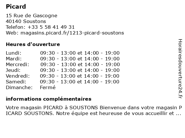 Votre magasin PICARD à SOUSTONS Bienvenue dans votre magasin PICARD SOUSTONS. Notre équipe est heureuse de vous accueillir et pourra vous conseiller avec professionnalisme et en toute simplicité...