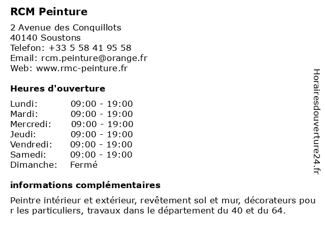 1 LMR Peinture (Distance: 5,54 km) 18 avenue Port d'Albret, 40140 Soustons fermeture, lmr, lmr peinture, menuiserie, miroiterie, peinture 6 Lagache Peinture (Distance: 12,86 km) 61 Rue du Pont de l'Est, 40150 Soorts-Hossegor lagache, peinture |