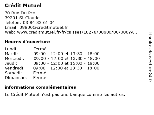 1 Crédit Mutuel (Distance: 0,00 km) 70 Rue du Pré, 39201 Saint-Claude agence, assurance, bancaire, banque, crédit, mutuel 2 Crédit Mutuel (Distance: 5,61 km) 6 T Rue du Jura, 39170 Saint-Lupicin agence, assurance, bancaire, banque, crédit, mutuel 3 Crédit Mutuel (Distance: 6,72 km) 3 Rue Du Cret Du Bief, 39170 Lavans Les St Claude compagnie de téléphone, crédit, mutuel, organisme d'assurance 4 Crédit Mutuel (Distance: 11,53 km) 1 Rue Pasteur, 39260 Moirans-en-Montagne agence, assurance, bancaire, banque, crédit, mutuel 5 Crédit Mutuel (Distance: 16,17 km) - Rue le Tetras, 01170 Gex agence, assurance, bancaire, banque, crédit, mutuel 6 Crédit Mutuel (Distance: 16,20 km) Rue Des Terreaux, 01170 Gex compagnie de téléphone, crédit, mutuel, organisme d'assurance |