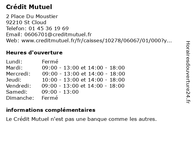 1 Crédit Mutuel (Distance: 0,00 km) 2 Place du Moustier, 92210 Saint-Cloud agence, assurance, bancaire, banque, crédit, mutuel 2 Crédit Mutuel (Distance: 1,14 km) 60 B Avenue Jean-Baptiste Clément, 92100 Boulogne-Billancourt agence, assurance, bancaire, banque, crédit, mutuel 3 Crédit Mutuel (Distance: 2,54 km) 181 Grande Rue, 92380 Garches compagnie de téléphone, crédit, mutuel, organisme d'assurance 4 Crédit Mutuel (Distance: 3,75 km) 32 Rue Camille Desmoulins, 92130 Issy-les-Moulineaux agence, assurance, bancaire, banque, crédit, mutuel 5 Crédit Mutuel (Distance: 5,10 km) 70 Rue Des Entrepreneurs, 75015 Paris compagnie de téléphone, crédit, mutuel, organisme d'assurance 6 Crédit Mutuel (Distance: 5,10 km) 70 Rue des Entrepreneurs, 75015 Paris agence, assurance, bancaire, banque, crédit, mutuel |