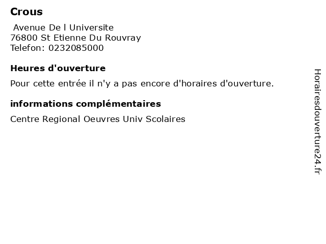1 Crous (Distance: 0,00 km) Avenue De l Universite, 76800 St Etienne Du Rouvray centre, crous, oeuvres, regional, restaurants, scolaires, univ 2 Crous (Distance: 0,74 km) Avenue Galilee, 76800 St Etienne Du Rouvray centre, crous, oeuvres, regional, restaurants, sco, univ 3 Crous (Distance: 6,39 km) Rue Du Faubourg Martainville, 76000 Rouen centre, crous, oeuvres, regional, restaurants, sco, univ 4 Crous (Distance: 6,46 km) 3 Rue Emile Leudet, 76000 Rouen centre, crous, oeuvres, regional, restaurants, sco, univ 5 Crous (Distance: 7,91 km) Rue Lavoisier, 76130 Mont St Aignan centre, crous, oeuvres, regional, restaurants, sco, univ 6 Crous (Distance: 8,28 km) Boulevard Andre Siegfried, 76130 Mont St Aignan centre, crous, oeuvres, regional, restaurants, scolaires, univ |