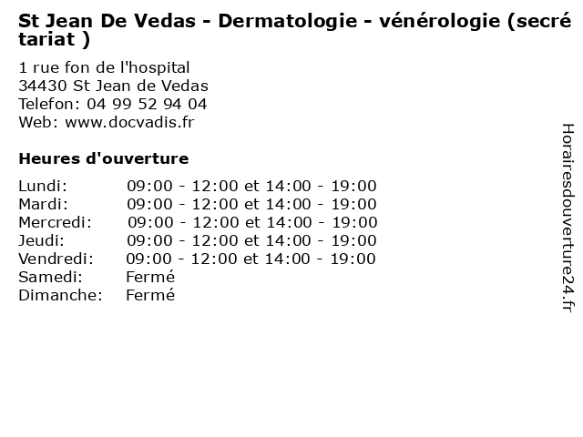 1 Dr.Eric Picot - Dermatologie - vénérologie (Consultation libre) (Distance: 0,00 km) 1 rue fon de l'hospital, 34430 St Jean de Vedas consultation, dermatologie, docteur, dr.eric, libre, picot, santé, vénérologie 2 Dr. Diane Labau Donnet - Dermatologie - vénérologie (Distance: 0,00 km) 1 rue fon de l'hospital, 34430 St Jean de Vedas consultation, dermatologie, diane, docteur, donnet, dr., labau, santé, vénérologie 3 Dr. Henri Fesneau - Dermatologie - vénérologie (Distance: 0,00 km) 1 rue fon de l'hospital, 34430 St Jean de Vedas consultation, dermatologie, docteur, dr., fesneau, henri, santé, vénérologie 4 Cabinet de dermatologie de l'hospital - Dermatologie - vénérologie (secrétariat ) (Distance: 0,00 km) 1 rue fon de l'hospital, 34430 Saint Jean de Vedas cabinet, consultation, de, dermatologie, docteur, l'hospital, santé, secrétariat, vénérologie 5 CHU Montpellier - Dermatologie - Capillaroscopie (Distance: 6,10 km) 191 Avenue du Doyen Gaston Giraud, 34090 Montpellier bureau, capillaroscopie, chu, consultation, dermatologie, dr, maladie, med, montpellier, médecin, médecine, pratique, thérapie, traitement 6 CHU Montpellier - Dermatologie - Consultation de phlébologie (Distance: 6,10 km) 191 Avenue du Doyen Gaston Giraud, 34090 Montpellier bureau, chu, consultation, de, dermatologie, dr, maladie, med, montpellier, médecin, médecine, phlébologie, pratique, thérapie, traitement |