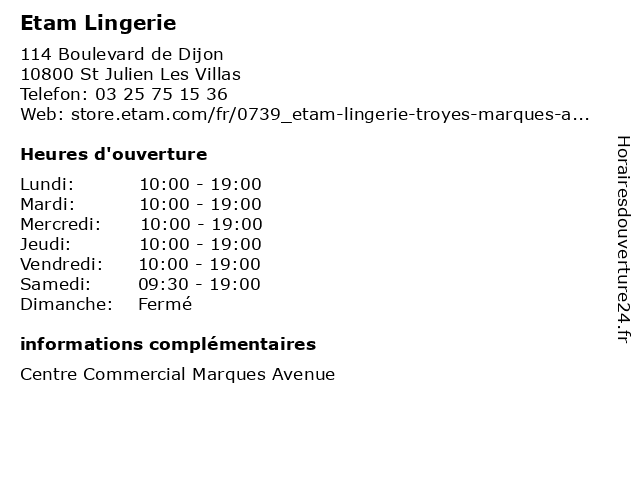 1 Etam Lingerie (Distance: 2,55 km) 81 Rue Emile Zola, 10000 Troyes brassieres, culottes, etam, femme, lingerie, nuisette 2 The Lingerie Shop (Distance: 0,00 km) 114 Boulevard de Dijon, 10800 St Julien Les Villas beaute, chaussures, lingerie, mode enfants, mode femmes, mode hommes, shop, sport, the 3 Triumph Lingerie - Outlet Troyes (Distance: 0,05 km) 114 Boulevard De Dijon Marques Avenue, 10800 St Julien Les Villas lingerie, magasin de maillots de bain, mode, outlet, triumph, troyes 4 ISIS Lingerie (Distance: 2,63 km) 68 Rue Urbain lV, 10800 Troyes boutique, isis, lingerie, sous, vêtements 5 Silhouette Lingerie (Distance: 2,63 km) 36 Rue Emile Zola, 10000 Troyes boutique, femme, lingerie, nuisette, nuit, silhouette 6 Orcanta Lingerie (Distance: 6,13 km) Voie du Bois, 10150 Pont-sainte-marie lingerie, magasin, mode, orcanta |