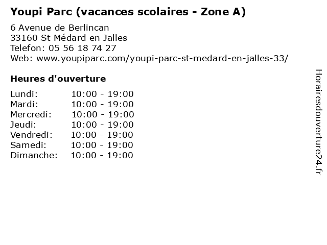 1 Youpi Parc (vacances scolaires - Zone A) (Distance: 11,65 km) 16 Avenue Louis de Broglie, 33600 Pessac enfants, loisirs, parc, scolaires, vacances, youpi, zone 2 Youpi Parc (vacances scolaires - Zone A) (Distance: 11,73 km) 36 Avenue du Dr Schinazi, 33300 Bordeaux enfants, loisirs, parc, scolaires, vacances, youpi, zone 3 Youpi Parc (Périodes Scolaires - Zone A) (Distance: 0,00 km) 6 Avenue de Berlincan, 33160 St Médard en Jalles enfants, hors, loisirs, parc, périodes, scolaires, vacances, youpi, zone 4 Piscine du Pinsan à Eysines (Vacances scolaires (hors vacances d'été)) (Distance: 2,79 km) - rue pinsan, 33320 Eysines d'été, du, eysines, hors, natation sportive, pinsan, piscine, scolaires, sportif, vacances 5 Piscine à Merignac - Petit bassin (Vacances scolaires (hors vacances d'été)) (Distance: 5,18 km) - Avenue truc, 33700 Mérignac bassin, d'été, hors, merignac, natation sportive, petit, piscine, scolaires, sportif, vacances 6 Piscine à Merignac - Grand Bassin (Vacances scolaires (hors vacances d'été)) (Distance: 5,18 km) - Avenue truc, 33700 Mérignac bassin, d'été, grand, hors, merignac, natation sportive, piscine, scolaires, sportif, vacances |