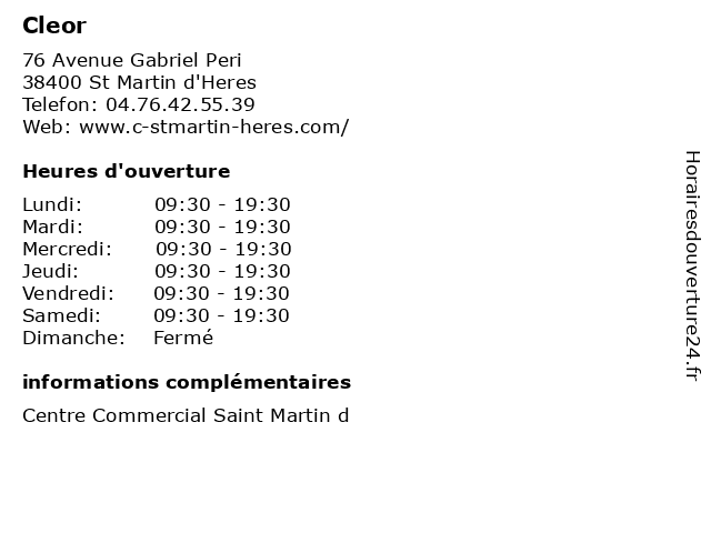 1 Cleor (Distance: 0,76 km) 76 Avenue Gabriel Péri, 38400 Saint-Martin D'Heres belledonne, centre, cleor, commercial, de, geant, heres, martin, saint, terrasse 2 Bijouterie Cleor (Distance: 3,75 km) 122 Grand’place, 38100 Grenoble bijouterie, bijoux, bracelets, cleor, montres, or 3 38 Energie (Distance: 0,00 km) 76 Avenue Gabriel Peri, 38400 St Martin d'Heres 38, beaute, cafe, chaussures, energie, enfants, maison, mode femmes, mode hommes, restaurant, sport 4 Cordonnerie (Distance: 0,00 km) 76 Avenue Gabriel Peri, 38400 St Martin d'Heres beaute, cafe, chaussures, cordonnerie, enfants, maison, mode femmes, mode hommes, restaurant, sport 5 SFR (Distance: 0,00 km) 76 Avenue Gabriel Peri, 38400 St Martin d'Heres beaute, cafe, chaussures, enfants, maison, mode femmes, mode hommes, restaurant, sfr, sport 6 Jules (Distance: 0,00 km) 76 Avenue Gabriel Peri, 38400 St Martin d'Heres beaute, cafe, chaussures, enfants, jules, maison, mode femmes, mode hommes, restaurant, sport |