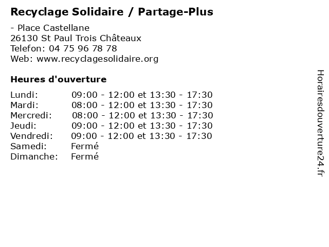 1 Recyclage Solidaire / Partage-Plus (Distance: 0,23 km) - rue de la Piscine, 26130 St Paul Trois Châteaux coordinateur, environnement, la protection, partage, plus, recyclage, solidaire 2 Recyclage Solidaire / Partage-Plus (Distance: 0,61 km) 22 chemin Jean Pradelle, 26130 St Paul Trois Châteaux coordinateur, environnement, la protection, partage, plus, recyclage, solidaire 3 Recyclage Solidaire / Partage-Plus (Distance: 2,60 km) - Le Village, 26130 St Restitut coordinateur, environnement, la protection, partage, plus, recyclage, solidaire 4 Recyclage Solidaire / Partage-Plus (Distance: 2,60 km) - Le Village, 26130 Solérieux coordinateur, environnement, la protection, partage, plus, recyclage, solidaire 5 Recyclage Solidaire / Partage-Plus (Distance: 2,60 km) - Le Village, 26130 Clansayes coordinateur, environnement, la protection, partage, plus, recyclage, solidaire 6 Recyclage Solidaire / Partage-Plus (Distance: 7,45 km) - Le Village, 26130 Montségur sur Lauzon coordinateur, environnement, la protection, partage, plus, recyclage, solidaire |