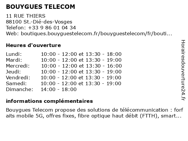 1 Coriolis Telecom (Distance: 2,06 km) 499 Rue Ernest Charlier, 88100 Sainte-Marguerite coriolis, internet, mobile, telecom, téléphone 2 Liberty Gym (Distance: 0,18 km) 10 rue des fusillés du 18 Novembre, 88100 Saint-Dié-des-Vosges acces, accès, cardio, club, fitness, gym, liberty, musculation 3 Point d'accès au Droit (Distance: 0,97 km) 14 Avenue Jean-Jaurès, 88100 Saint Die Des Vosges au, d'accès, droit, point, public, services 4 Bouygues Telecom (Distance: 20,01 km) 46 Avenue de Lattre de Tassigny, 5300 Laval beaute, bouygues, cafe, chaussures, enfants, hommes, lingerie, mode femmes, restaurant, sport, telecom 5 BOUYGUES TELECOM (Distance: 35,78 km) Rue du Buehlfeld, 68125 Houssen bouygues, fai, fournisseur d'accès internet, telecom, téléphonie mobile 6 BOUYGUES TELECOM (Distance: 35,78 km) Rue du Buehlfeld, 68125 Houssen 5g, accessoires, acheter téléphone, apple, boutique bouygues telecom, bouygtel, bouygue, bouygue telecom, bouygues, bouygues telecom, bouygues telephone, bouygues télécom, bouyguestelecom, box internet, fibre, fibre optique, fixe, forfait mobile, fournisseur d'accès à internet, internet, internet haut débit, iphone, magasin bouygues, offres fixes, offres groupées, offres internet, opérateur, opérateur fixe, opérateur mobile, raccordement fibre optique haut débit (ftth), reprise mobile, réparation mobile, samsung, samsung galaxy, smartphones, telecom, télécommunication, téléphonie, téléphonie fixe, télévision |