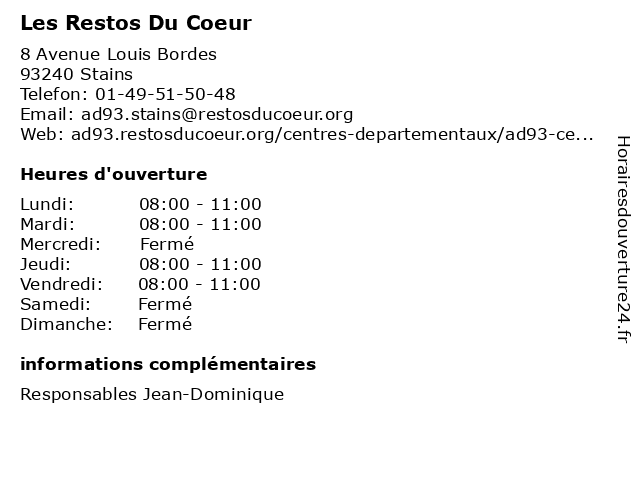 1 Les Restos Du Coeur (Distance: 2,04 km) 5 Avenue Louise Larivière, 93440 Dugny aide, coeur, dons, du, les, resto, restos, solidarité, vente 2 Les Restos Du Coeur (Distance: 2,80 km) 4 Avenue Paul Valéry, 95200 Sarcelles aides, alimentaire, coeur, du, les, restos, santé, solidarité, soutien 3 Les Restos Du Coeur (Distance: 3,53 km) 85 Rue Maurice Grandcoing, 93430 Villetaneuse aides, alimentaire, coeur, du, les, restos, santé, solidarité, soutien 4 Les Restos Du Coeur (Distance: 3,85 km) 43 Boulevard Anatole France, 93300 Aubervilliers aides, alimentaire, coeur, du, les, restos, santé, solidarité, soutien 5 Les Restos Du Coeur (Distance: 5,37 km) n/a Cité administrative N° 2, 93000 Bobigny aide, coeur, dons, du, les, resto, restos, solidarité, vente 6 Les Restos du Coeur (Distance: 6,72 km) 14 rue Gilberte Desnoyer, 93600 Aulnay-sous-Bois aide, coeur, dons, du, les, resto, restos, solidarité, vente |