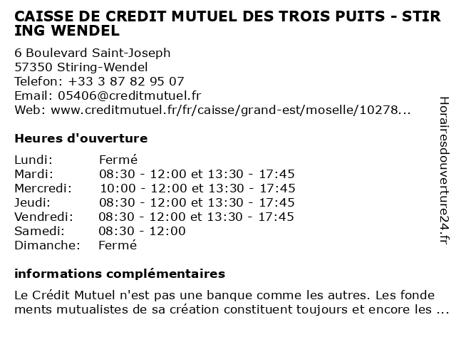 Termes de recherche pour CAISSE DE CREDIT MUTUEL DES TROIS PUITS - STIRING WENDEL:de, trois, des, crédit, mutuel, caisse, puits, stiring, wendel |