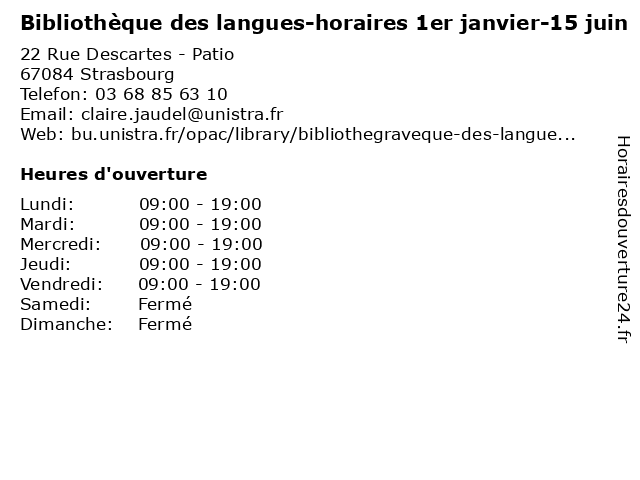 Termes de recherche pour Bibliothèque des langues-horaires 1er janvier-15 juin:des, horaires, livres, 1er, bibliotheque, 15, juin, janvier, langues, revues, cd audio, cd.rom |