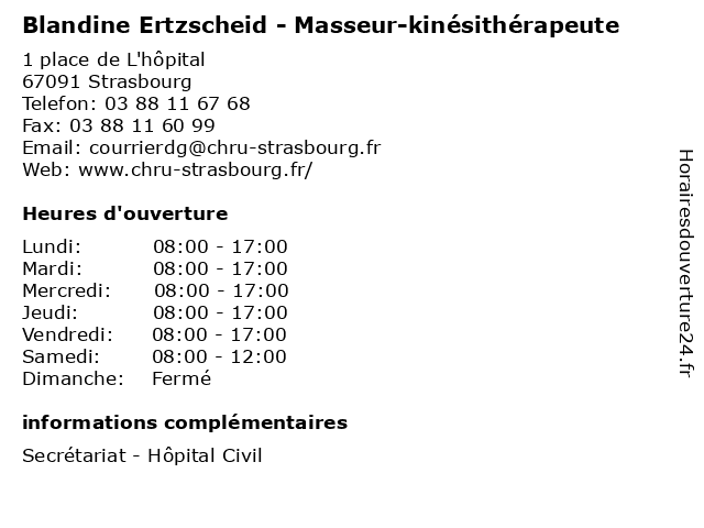 1 Dr Blandine Simeu-Tamnou - Chirurgien général (Distance: 0,00 km) 1 place de L'hôpital, 67091 Strasbourg blandine, chirurgien, consultation, docteur, dr, général, med, médecin, simeu, tamnou, traitement 2 Blandine Mathis - Sage-femme (Distance: 34,78 km) 19 côte de Saverne, 67700 Saverne blandine, consultation, docteur, dr, femme, mathis, med, médecin, sage, traitement 3 Nisi Olivier Masseur-Kinésithérapeute du Sport Diplômé d'Etat (Distance: 0,77 km) 26 Rue de la Thumenau, 67100 Strasbourg d'etat, diplômé, du, kinésithérapeute, kinésithérapie, masseur, nisi, olivier, rééducation, sport 4 Lionel Peterschmitt - Masseur-kinésithérapeute - secrétariat (Distance: 0,82 km) 20 Place Broglie, 67000 Strasbourg docteur, kinésithérapeute, lionel, masseur, médecin, médecine, ostéopathe, peterschmitt, secrétariat 5 Ouadih Faraj - Masseur-kinésithérapeute - secrétariat (Distance: 2,31 km) 6 Passage de Bratislava, 67100 Strasbourg docteur, faraj, kinésithérapeute, masseur, médecin, médecine, ostéopathe, ouadih, secrétariat 6 Bénédicte Werlé - Masseur-kinésithérapeute (Distance: 25,54 km) 49 Faubourg du Rhin, 67230 Benfeld bénédicte, docteur, kinésithérapeute, masseur, médecin, médecine, secrétariat, werlé |