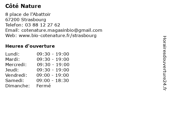 1 Côté Nature (Distance: 6,54 km) 3 Rue de l’Industrie, 67550 Vendenheim alimentation, bio, côté, fruits, légumes, nature, épicerie 2 Côté Nature (Distance: 7,08 km) 13 rue de l'Industrie, 67400 Illkirch Graffenstaden côté, magasin bio, nature, produits diététiques 3 Alsace Nature (Distance: 0,99 km) 8 rue Adèle Riton, 67000 Strasbourg alsace, association, environnement, nature, organisation, préservation 4 Nature et Découvertes Strasbourg (Distance: 1,41 km) 24 Place des Halles, 67000 Strasbourg découvertes, et, nature, strasbourg 5 Nature et Découvertes Hallebardes (Distance: 2,16 km) 19 Rue des Hallebardes, 67000 Strasbourg découvertes, et, hallebardes, nature 6 Union Tour Amis Nature (Distance: 2,63 km) 11 Rue De Bretagne, 67300 Schiltigheim amis, nature, tour, union |