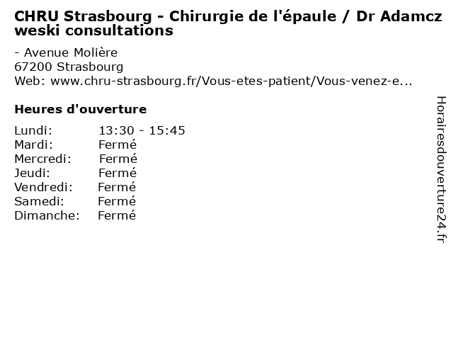 1 CHRU Strasbourg - Chirurgie de l'épaule / Dr Adamczweski (Distance: 0,00 km) - Avenue Molière, 67200 Strasbourg adamczweski, bureau, chirurgie, chru, consultation, de, dr, l'épaule, maladie, med, médecin, médecine, pratique, strasbourg, thérapie, traitement 2 CHRU Strasbourg - Chirurgie de l'épaule / Consultations post-urgences (Distance: 0,00 km) - Avenue Molière, 67200 Strasbourg bureau, chirurgie, chru, consultation, consultations, de, dr, l'épaule, maladie, med, médecin, médecine, post, pratique, strasbourg, thérapie, traitement, urgences 3 CHRU Strasbourg - Chirurgie de l'épaule / Pr Clavert (Distance: 3,79 km) 1 Place de l'hôpital, 67091 Strasbourg bureau, chirurgie, chru, clavert, consultation, de, dr, l'épaule, maladie, med, médecin, médecine, pr, pratique, strasbourg, thérapie, traitement 4 CHRU Strasbourg - Chirurgie de l'épaule / Pr Clavert sur rendez-vous (Distance: 3,79 km) 1 Place de l'hôpital, 67091 Strasbourg bureau, chirurgie, chru, clavert, consultation, de, dr, l'épaule, maladie, med, médecin, médecine, pr, pratique, rendez, strasbourg, sur, thérapie, traitement, vous 5 CHRU Strasbourg - Chirurgie de l'épaule / Consultations post-urgences (Distance: 3,79 km) 1 Place de l'hôpital, 67091 Strasbourg bureau, chirurgie, chru, consultation, consultations, de, dr, l'épaule, maladie, med, médecin, médecine, post, pratique, strasbourg, thérapie, traitement, urgences 6 CHRU Strasbourg - Chirurgie de l'épaule / Dr Lengert sur rendez-vous (Distance: 3,79 km) 1 Place de l'hôpital, 67091 Strasbourg bureau, chirurgie, chru, consultation, de, dr, l'épaule, lengert, maladie, med, médecin, médecine, pratique, rendez, strasbourg, sur, thérapie, traitement, vous |
