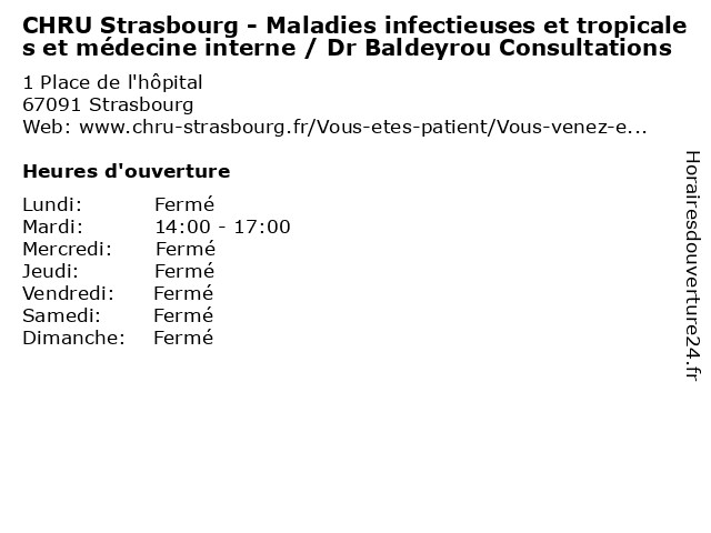 Termes de recherche pour CHRU Strasbourg - Maladies infectieuses et tropicales et médecine interne / Dr Baldeyrou Consultations:et, strasbourg, bureau, med, medecine, maladie, traitement, interne, médecin, consultation, dr, consultations, pratique, chru, maladies, therapie, infectieuses, tropicales, baldeyrou |