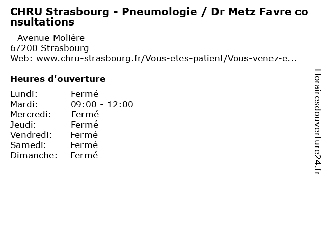 1 CHRU Strasbourg - Asthme et allergologie / Dr Metz Favre (Distance: 0,00 km) - Avenue Molière, 67200 Strasbourg allergologie, asthme, bureau, chru, consultation, dr, et, favre, maladie, med, metz, médecin, médecine, pratique, strasbourg, thérapie, traitement 2 CHRU Strasbourg - Asthme et allergologie / Dr Metz Favre consultations (Distance: 0,00 km) - Avenue Molière, 67200 Strasbourg allergologie, asthme, bureau, chru, consultation, consultations, dr, et, favre, maladie, med, metz, médecin, médecine, pratique, strasbourg, thérapie, traitement 3 CHRU Strasbourg - Pneumologie / Dr Metz Favre (Distance: 0,00 km) - Avenue Molière, 67200 Strasbourg bureau, chru, consultation, dr, favre, maladie, med, metz, médecin, médecine, pneumologie, pratique, strasbourg, thérapie, traitement 4 Dr Carine Favre-Metz - Pneumologue (Distance: 3,31 km) 1 Place De L'Hopital, 67100 Strasbourg carine, dr, favre, metz, médecins, médicaments, pneumologue, santé, secrétariat, spécialiste 5 Dr Nora Metz - Médecin généraliste (Distance: 3,63 km) 7 Rue des Bouchers, 67000 Strasbourg 67000, benedic, cabinet, docteur, dr, generaliste, généraliste, medecin, metz, médecin, médical, nora, roland, strasbourg 6 Dr Pierre-Alexandre De Metz - Psychiatre (Distance: 3,78 km) 6 Rue des Arquebusiers, 67000 Strasbourg alexandre, de, dr, folie, metz, pierre, psychiatre, psychiatrie, psychiatrique |