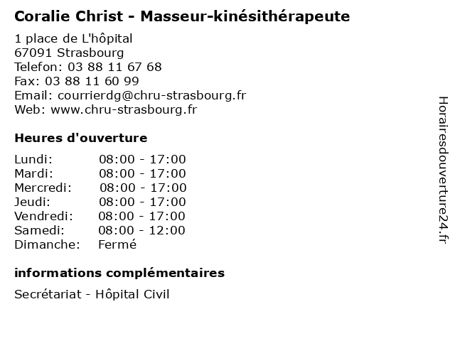 1 Maître Coralie Barraux - Avocate (Distance: 0,69 km) 9-10 Place du Temple Neuf, 67000 Strasbourg avocate, avocats, barraux, cabinet, coralie, juridique, justice, maître, services 2 Coiffure Christ Nicolas (Distance: 1,42 km) 8 Place Sébastien Brant, 67000 Strasbourg christ, coiffure, nicolas 3 Coiffeur Nicolas Christ (Distance: 1,63 km) 5 rue de Boston, 67000 Strasbourg by, cheveux, christ, coiffeur, joël, nicolas 4 Coralie Hochard - Sophrologue (Distance: 1,65 km) 3 Place de Haguenau, 67000 Strasbourg coralie, hochard, medecin, sante, sophro, sophrologue 5 Christ Elec (Distance: 1,95 km) 29 Boulevard Tauler, 67000 Strasbourg christ, dépannage electrique, elec, electricien, installation 6 Dr Coralie Lassus - Chirurgien-dentiste (Distance: 3,05 km) 171 Route de Schirmeck, 67200 Strasbourg chirurgien, coralie, dentaire, dentiste, dr, implantologie, lassus, parodontologie |