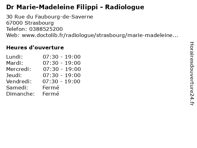 1 Dr Marie-Madeleine Filippi - Radiologue (Distance: 2,49 km) 26 Rue des Carolingiens, 67200 Strasbourg 67, d'imagerie, de, diagnostique, dr, et, filippi, groupe, imagerie, imagis, madeleine, marie, médicale, radiologie, radiologue, thérapeutique 2 Dr Marie-Madeleine Filippi - Radiologue (Distance: 2,60 km) 85 Route du Polygone, 67100 Strasbourg 67, d'imagerie, de, diagnostique, dr, et, filippi, groupe, imagerie, imagis, madeleine, marie, médicale, radiologie, radiologue, thérapeutique 3 Dr Marie-Madeleine Filippi - Radiologue (Distance: 2,60 km) 46 Boulevard d'Anvers, 67000 Strasbourg 67, d'imagerie, de, diagnostique, dr, et, filippi, groupe, imagerie, imagis, madeleine, marie, médicale, radiologie, radiologue, thérapeutique 4 Ecole élémentaire publique Sainte Madeleine (Distance: 1,37 km) 2 place Sainte Madeleine, 67000 Strasbourg ecole, education, madeleine, maternelle, primaire, publique, sainte, services, strasbourg, école, élémentaire 5 Marie-Madeleine Vonau - Psychologue (Distance: 1,53 km) 5 Place de Bordeaux,, 67000 Strasbourg madeleine, marie, psy, psychiatre, psychologue, sante, soins, vonau 6 |