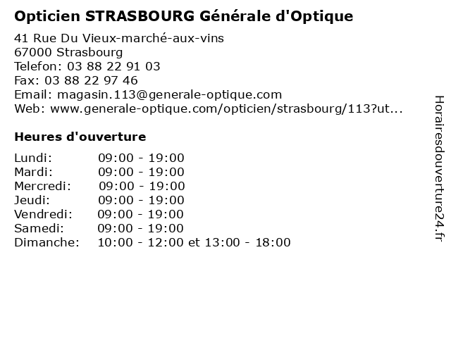 1 Société Générale (Distance: 0,03 km) 48 RUE VX MARCHE AUX VINS, 67000 Strasbourg agence, devis d'assurance automobile, générale, prêt à domicile, prêt à la consommation, société 2 Lissac l'Opticien Strasbourg - Lunettes de vue, de soleil, lentilles (Distance: 0,09 km) 1 Place de l'Homme de Fer, 67000 Strasbourg de, l'opticien, lentilles, lentilles de contact, lissac, lunettes, lunettes de soleil, lunettes de vue, opticien, opticien lissac, soleil, strasbourg, vue 3 Opticien Direct Optic FERMÉ (Distance: 0,14 km) 27 Rue du vieux marché aux vins, 67000 Strasbourg direct, fermé, magasin de lunettes de soleil, optic, opticien, optométrie 4 Derhy Opticien Optométriste (Distance: 0,15 km) 31 Rue Thomann, 67000 Strasbourg derhy, lunettes, opticien, optique, optométriste 5 Écouter Voir Optique STRASBOURG HAUTE MONTEE (Distance: 0,16 km) 27 Rue de la Haute Montée, 67000 Strasbourg haute, montee, optique, strasbourg, voir, écouter 6 OPTIC DUROC - OPTICIEN & AUDIOPROTHESISTE - STRASBOURG (Distance: 0,22 km) 22 Rue du 22 Novembre, 67000 Strasbourg audioprothesiste, duroc, optic, opticien, strasbourg |