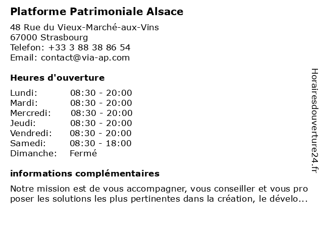 1 VIA LA PLATEFORME PATRIMONIALE (Distance: 0,01 km) 48 Rue Du Vieux Marche Aux Vins, 67000 Strasbourg la, patrimoniale, plateforme, via 2 Découvrir l'Alsace (Distance: 0,71 km) 20 Place de la Gare, 67000 Strasbourg boutique, découvrir, l'alsace, presse, restaurant, services, tabac, transport 3 Onepark / P+R Ducs d'Alsace Parking (dépôt ) (Distance: 2,20 km) - Rue des Ducs, 67000 Strasbourg d'alsace, ducs, dépôt, onepark, p+r, parking, services 4 Onepark / P+R Ducs d'Alsace Parking (récupération entre) (Distance: 2,20 km) - Rue des Ducs, 67000 Strasbourg d'alsace, ducs, entre, onepark, p+r, parking, récupération, services 5 Banque Populaire Alsace Lorraine Champagne (Distance: 3,72 km) 65 route de Bischwiller, 67800 Bischheim alsace, assurances, banque, champagne, lorraine, populaire 6 En Passant Par L'Alsace (Distance: 7,84 km) 68 Route Nationale, 67450 Mundolsheim cafe, chaussures, en, enfants, homme, l'alsace, lingerie, mode femme, par, passant, restaurant, service |