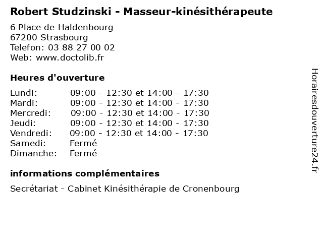 Termes de recherche pour Robert Studzinski - Masseur-kinésithérapeute:de, robert, cabinet, soin, m., kinésithérapie, rééducation, kiné, masseur, kinésithérapeute, haldenbourg, studzinski, cronembourg |