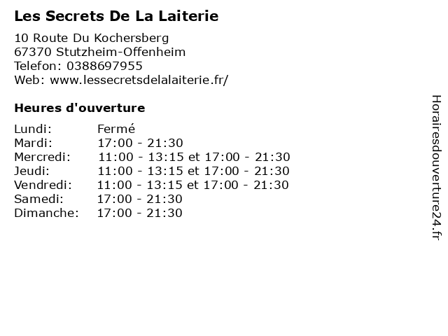1 Les Secrets de la Laiterie (Distance: 0,00 km) 10 Route du Kochersberg, 67370 Stutzheim-Offenheim bar, bistro, bistrot, brasserie, café, de, la, laiterie, les, pub, restaurant, restauration, resto, secrets 2 Secrets de Table (Distance: 10,77 km) 39 rue 22 Novembre, 67000 Strasbourg bistrot, café, de, restaurnt, secrets, table 3 Les Secrets des Grands Express (Distance: 13,85 km) Rue du Pont-du-Péage, 67118 Geispolsheim des, express, grands, les, restaurants, restauration, secrets 4 Les Secrets de l'Orient Express au Musée du Chocolat - Geispolsheim (Distance: 14,01 km) , Rue du Pont du Péage, 67118 Geispolsheim au, boulangers, cafes, chocolat, de, du, epiceries, express, fromagers, geispolsheim, l'orient, les, musée, patisseries, restaurant, secrets 6 |