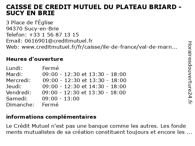 Termes de recherche pour CAISSE DE CREDIT MUTUEL DU PLATEAU BRIARD - SUCY EN BRIE:en, du, de, brie, sucy, crédit, mutuel, caisse, plateau, briard |