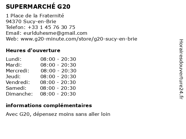 1 Supermarché G20 (Distance: 0,03 km) 1 place DEGAS, 94370 SUCY-en-BRIE carte bleue, carte g2, dépôt de pain, dépôt pressing, g20, livraison à domicile, photocopieur, supermarché, supermarket 2 Supermarché G20 (Distance: 9,36 km) 12 place de la Gare, 94350 VILLIERS-sur-MARNE carte bleue, carte g2, dépôt de pain, dépôt pressing, g20, livraison à domicile, photocopieur, supermarché, supermarket 3 Supermarché G20 (Distance: 12,42 km) 3 rue Gustave Nast, 77500 CHELLES carte bleue, carte g2, dépôt de pain, dépôt pressing, g20, livraison à domicile, photocopieur, supermarché, supermarket 4 Supermarché G20 (Distance: 13,23 km) - Rue de l’abreuvoir, 77380 Combs la Ville courses, fruits, g20, légumes, nourritures, supermarché 5 Supermarché G20 (Distance: 15,35 km) 76 Rue Vieille du Temple, 75003 Paris alimentation, distributeur alimentaire, g20, supermarché, supérette, épicerie 6 Supermarché G20 (Distance: 15,86 km) 2 Rue Beaurepaire, 75010 Paris alimentation, distributeur alimentaire, g20, supermarché, supérette, épicerie |