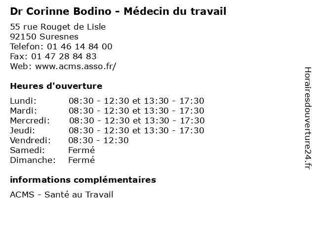 1 Dr Helene Attali - Médecin du travail (Distance: 0,00 km) 55 rue Rouget de Lisle, 92150 Suresnes attali, consultation, docteur, dr, du, helene, med, médecin, traitement, travail 2 Dr Marie-France Beaugerie - Médecin du travail (Distance: 0,00 km) 55 rue Rouget de Lisle, 92150 Suresnes beaugerie, consultation, docteur, dr, du, france, marie, med, médecin, traitement, travail 3 ACMS - Centre de Santé au Travail (Distance: 0,48 km) 11 Rue Salomon de Rothschild, 92150 Suresnes acms, au, bilan, centre, de, santé, travail 4 ACMS - Centre de Santé au Travail (Distance: 4,25 km) 73 avenue des Ternes, 75017 Paris a.c.m.s, acms, au, bilans, centre, de, santé, travail 5 Maître Thomas André Avocat en droit du travail à Paris (Distance: 4,63 km) 65 av. de Versailles, 75016 Paris andré, avocat, conseil, droit, du, en, maître, paris, thomas, travail 6 Sécurité Travail (Distance: 4,84 km) 11 Rue de Bassano, 75116 Paris consultant, consulter, ingénierie, ingénieur, sécurité, travail |