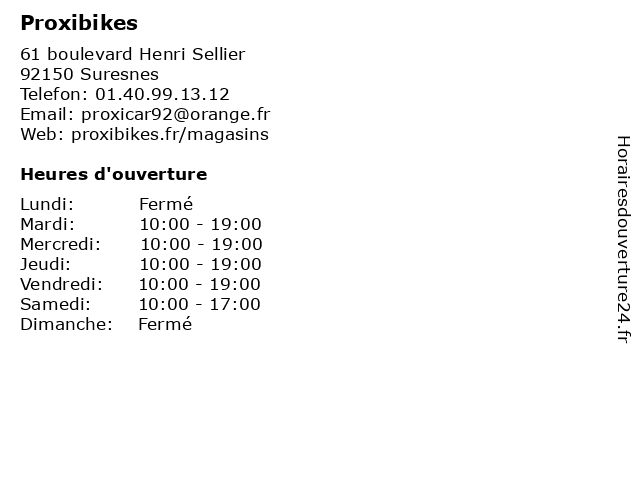 1 Proxibikes (Distance: 16,84 km) 24 Rue du Buisson aux Fraises, 91300 Massy atelier, cycle, entretien, proxibikes, réparation, velo, vente 2 Station Velo Velib (Distance: 0,23 km) - Rue de Saint-Cloud, 92150 Suresnes bike, drive, espace vert, nature, parc, service, station, velib, velo 3 Station Velo Velib (Distance: 0,70 km) 18 Rue de Verdun, 92150 Suresnes bike, drive, espace vert, nature, parc, service, station, velib, velo 4 Station Velo Velib (Distance: 0,77 km) 15 Rue Ledru Rollin, 92150 Suresnes bike, drive, espace vert, nature, parc, service, station, velib, velo 6 Station Velo Velib (Distance: 2,63 km) 2 Boulevard Jean Jaurès, 92100 Boulogne-Billancourt bike, drive, espace vert, nature, parc, service, station, velib, velo |