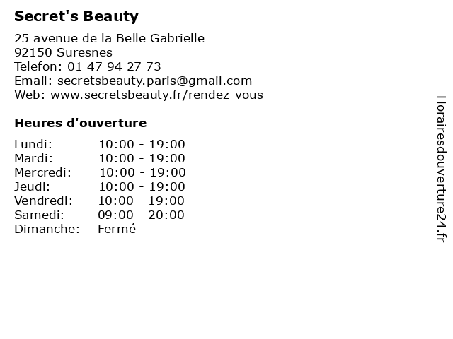 2 O'Jardin Secret (Distance: 1,12 km) 134 Boulevard Henri Sellier, 92150 Suresnes bar, café, giardino, o'jardin, restaurants, secret, segreto 4 Niwel Beauty (Distance: 2,55 km) 15 Parvis de la Défense, 92092 Paris La Défense beauty, centre, commercial, defense, la, les, niwel, paris, temps 5 Pure Beauty Bar (Distance: 3,67 km) 185 Rue Gallieni, 921000 Boulogne-Billancourt bar, beauty, institut de beauté, manucure, maquillage, pure, soins, épilations 6 Secret Training / Coaching Collectif - pilates (Distance: 4,08 km) 15 rue Daumier, 75016 Paris coaching, collectif, exercise, fitness, health, outdoor, physical activities, pilates, secret, sports, training |
