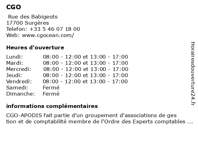 1 CGO Comptabilité Gestion Océan (Distance: 0,01 km) Rue des Babigeots, 17700 Surgères cgo, comptabilité, gestion, océan 2 CGO Comptabilité Gestion Océan (Distance: 23,18 km) 2 Rue du Petit Port Marchand, 17300 Rochefort cgo, comptabilité, gestion, océan 4 CGO Comptabilité Gestion Océan (Distance: 24,20 km) 3 Avenue Gustave Eiffel, 17400 Saint-Jean-d'Angély cgo, comptabilité, gestion, océan 6 CGO Comptabilité Gestion Océan (Distance: 39,88 km) 18 Rue des Droits de l'Homme, 17320 Marennes-Hiers-Brouage cgo, comptabilité, gestion, océan |