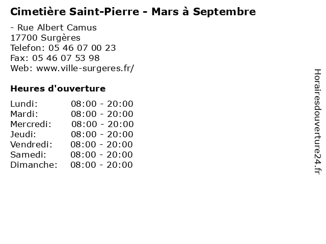 1 Cimetière Saint-Pierre - Octobre à Février (Distance: 0,00 km) - Rue Albert Camus, 17700 Surgères caveau, cimetière, d'octobre, défunts, funéraire, février, municipal, octobre, pierre, saint, service 2 BOULANGERIE SAINT PIERRE (Distance: 0,49 km) 14 Avenue De Saint Pierre, 17700 SURGERES boulangerie, pierre, saint 3 Cimetière Saint-Gilles - Mars à Septembre (Distance: 1,17 km) - Rue du Faubourg Saint Gilles, 17700 Surgères caveau, cimetière, de, défunts, funéraire, gilles, mars, municipal, saint, septembre, service 4 Déchetterie (du 16 mars au 30 septembre) (Distance: 1,86 km) - Saint Mard, 17700 Vandré 16, 30, au, decheterie, du, déchetterie, mars, septembre, smictom 5 Déchetterie (du 1er octobre au 15 mars ) (Distance: 1,86 km) - Saint Mard, 17700 Vandré 15, 1er, au, decheterie, du, déchetterie, mars, octobre, smictom 6 Déchetterie (du 16 mars au 30 septembre) (Distance: 4,25 km) - La Chaume des Fétis, 17700 Vouhé 16, 30, au, decheterie, du, déchetterie, mars, septembre, smictom |