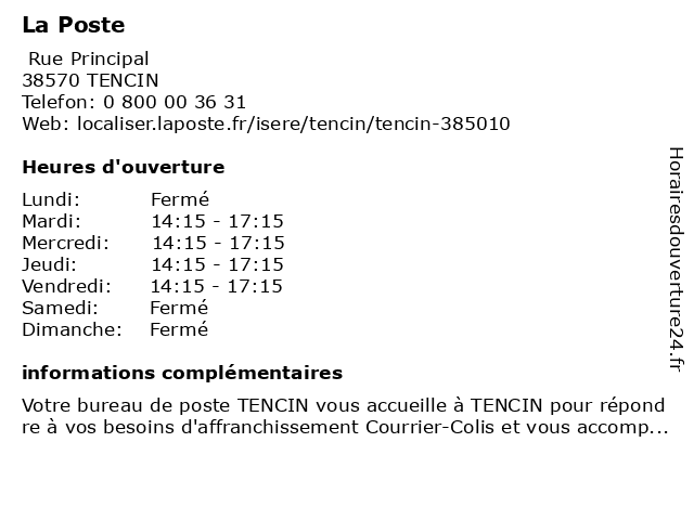 1 La Poste (Distance: 0,25 km) - Rue Principale, 38570 Tencin agence, assurance, banque, banque postale, bureau de poste, chronopost, colis, courrier, dps, expéditions internationales, la, point, postale, poste, relais, timbres, téléphonie, ups, western union 2 La Poste (Distance: 2,73 km) 60 Place de la Mairie, 38660 La Terrasse agence, assurance, banque, banque postale, bureau de poste, chronopost, colis, courrier, dps, expéditions internationales, la, point, postale, poste, relais, timbres, téléphonie, ups, western union 3 La Poste (Distance: 3,95 km) - Avenue des Tirignons, 38570 Goncelin agence, assurance, banque, banque postale, bureau de poste, chronopost, colis, courrier, dps, expéditions internationales, la, point, postale, poste, relais, timbres, téléphonie, ups, western union 4 La Poste (Distance: 5,41 km) - Place de l'Église, 38660 Le Touvet agence, assurance, banque, banque postale, bureau de poste, chronopost, colis, courrier, dps, expéditions internationales, la, point, postale, poste, relais, timbres, téléphonie, ups, western union 6 |