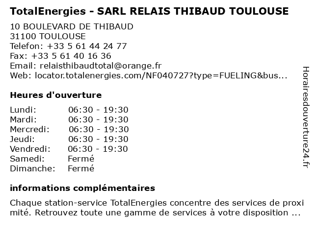 Termes de recherche pour TotalEnergies - SARL RELAIS THIBAUD TOULOUSE:relais, toulouse, sarl, total, gas station, thibaud, station service, tankstelle, totalenergies |