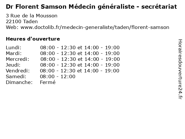 | Mercredi | 08:00-12:30 et 14:00-19:00 |