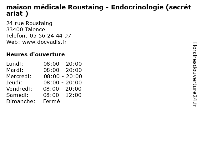 Termes de recherche pour maison médicale Roustaing - Endocrinologie (secrétariat ):médicale, maison, santé, secretariat, docteur, consultation, endocrinologie, roustaing |