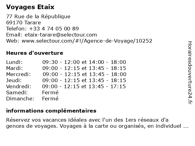 2 Jetset Voyages / Voyages Etaix (Distance: 0,02 km) 77 Rue De La République, 69170 Tarare agence, billet d'avion et hôtel pour votre club, etaix, jetset, séjour, voyages 3 E.Leclerc Voyages (Distance: 3,10 km) 550 Boulevard Turdine, 69490 Saint Loup e.leclerc, service, services, services à la personne, voyages 4 Jetset Voyages / Voyages Etaix (Distance: 15,53 km) 27 Rue Charles de Gaulle, 69210 L'Arbresle agence, circuits, etaix, hotel, jetset, séjour, voyages 5 Selectour Bleu Voyages (Distance: 34,33 km) 10 Chemin Petit, 69300 Caluire-et-Cuire bleu, cafe, deco, enfants, homme, mode femme, restaurant, selectour, voyages 6 Selectour Bleu Voyages (Distance: 34,55 km) 10 Chemin Jean Petit, 69300 Lyon beaute, bleu, bouygues, cafe, chausures, club, enfants, mode femmes, mode hommes, restaurant, selectour, sport, telecom, voyages |