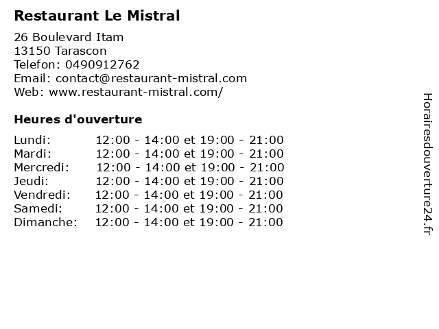 | Mardi | 12:00-14:00 et 19:00-21:00 |