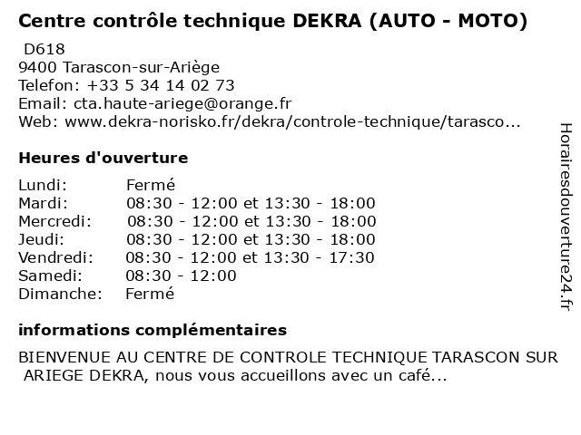 Description de l'entreprise :Préparer votre contrôle techniquePour préparer votre contrôle technique dans notre centre DEKRA de Tarascon-sur-Ariège, vous pouvez vérifier en amont différents points comme les pneumatiques, la visibilité, le niveau d'huile ou encore l'habitacle. Pour tout savoir, consultez notre vidéo. Voir l'offre |