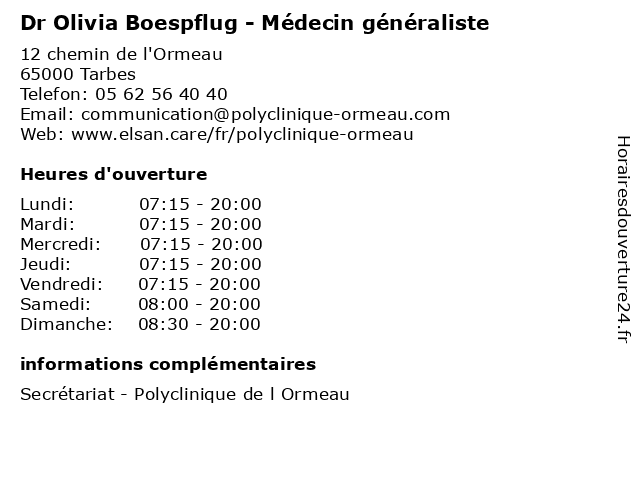 1 Aprium Pharmacie de l'Ormeau- Aprium - Olivia TURON (Distance: 0,30 km) 8-10 Rue Louis de Broglie, 65000 Tarbes 65000, aprium, aromathérapie, beauté, compléments alimentaires, covid-19, de, homéopathie, hygiène orale, l'ormeau, matériel médical, médicaments, olivia, orthopédie, parapharmacie, pharmacie, pharmacie bio, produits vétérinaires, tarbes, test antigéniques, turon, vaccination, équipements médicaux 2 Olivia Mariol - Avocate (Distance: 37,38 km) 8 rue Duplaa, 64000 Pau avocate, droit, juridictionnelle, mariol, négociation, olivia 3 Olivia Sauvanaud - Psychologue (Distance: 42,38 km) 6 Rue de Lasbordes, 64230 Lescar olivia, psy, psychiatre, psychologue, sante, sauvanaud, soins 4 Dr Frédéric Mialhe - Médecin généraliste (Distance: 0,00 km) 12 chemin de l'Ormeau, 65000 Tarbes consultation, docteur, dr, frederic, frédéric, généraliste, med, mialhe, médecin, médecine, traitement 5 Dr Patrice Teste - Médecin généraliste (Distance: 0,00 km) 12 chemin de l'Ormeau, 65000 Tarbes consultation, docteur, dr, généraliste, gériatre, med, médecin, médecine, patrice, teste, traitement 6 Adecco Généraliste (Distance: 1,91 km) 9 Rue du Magasin aux Tabacs, 65000 Tarbes adecco, agences, cdd, cdi, emploi, emploi intérim, généraliste, services |