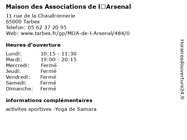 1 Maison des Associations de l’Arsenal (Distance: 0,00 km) 11 rue de la Chaudronnerie, 65000 Tarbes art floral, associations, chorale, de, des, généalogie, l’arsenal, maison, peinture, philatélie 2 Maison des Associations Laubadère (Distance: 0,89 km) - Rue de l’ Ossau, 65000 Tarbes activites, associations, des, do in, gymnastique, laubadère, maison, sportives, yoga 3 Maison des Associations du Martinet (Distance: 1,06 km) - Rue Marie Saint Frai, 65000 Tarbes amitié nature, association, associations, bridge club, des, du, federation, maison, martinet, martinet loisirs 4 Maison des Associations Rue Latil (Distance: 1,46 km) 21 rue du IV septembre, 65000 Tarbes association, associations, des, latil, maison, rando65, rotary club, rue, syst'aime, tarbes moto club 5 Casa Tipica - a Tasca Do Zeca (Distance: 19,10 km) Le Frelon, 65100 Lourdes casa, do, restaurants, tasca, tipica, zeca 6 Aude Siffre - Ostéopathe DO (Distance: 31,22 km) 36 Route de Tarbes, 64320 Idron aude, cabinet, diagnostique, do, ostéopathe, ostéopathie, siffre |
