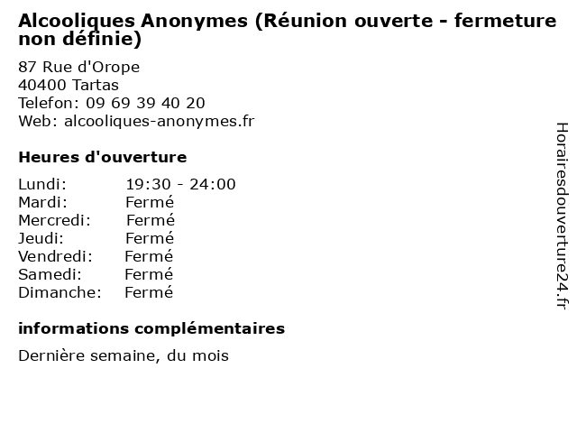 1 Alcooliques Anonymes (Réunion fermée - fermeture non définie) (Distance: 0,00 km) 87 Rue d'Orope, 40400 Tartas alcooliques, anonymes, définie, fermeture, fermée, non, réunion 2 Alcooliques Anonymes (Ouverte à tout public - fermeture non définie) (Distance: 0,00 km) 87 Rue d'Orope, 40400 Tartas alcooliques, anonymes, définie, fermeture, non, ouverte, public, réunion, tout 3 Alcooliques Anonymes (Ouverte à tout public - fermeture non définie) (Distance: 24,84 km) 6 Avenue de la République, 40100 Dax alcooliques, anonymes, définie, fermeture, non, ouverte, public, réunion, tout 4 Alcooliques Anonymes (Réunion fermée - fermeture non définie) (Distance: 24,84 km) 6 Avenue de la République, 40100 Dax alcooliques, anonymes, définie, fermeture, fermée, non, réunion 5 Alcooliques Anonymes (Réunion ouverte - fermeture non définie) (Distance: 24,84 km) 6 Avenue de la République, 40100 Dax alcooliques, anonymes, définie, fermeture, non, ouverte, réunion 6 Alcooliques Anonymes (Ouverte à tout public - fermeture non définie) (Distance: 24,98 km) 22 Boulevard Ferdinand de Candau, 40000 Mont-de-Marsan alcooliques, anonymes, définie, fermeture, non, ouverte, public, réunion, tout |