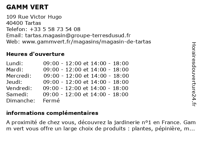 1 GAMM VERT (Distance: 10,48 km) Route de Dax, 40250 Mugron alimentation animale, bricolage, bulbes, cartouche, chaussures de sécurité, décoration, gamm, gaz, granulés de bois, jardinerie, local, motoculture, plante d'extérieur, plante d'intérieur, plantes, pêche, semences, terreau, terroir, vert, végétaux, vêtements de travail 2 Gamm vert (Distance: 10,48 km) Avenue René Bats, 40250 Mugron animalerie, gamm, jardin, jardinerie, mobilier de jardin, plantes, pépinière, vert 3 Votre Point Vert (Distance: 0,19 km) n/a Route de Junca, 40400 TARTAS animals, clothing, flower market, garden, garden tools, interior, pet, point, vert, votre 6 |