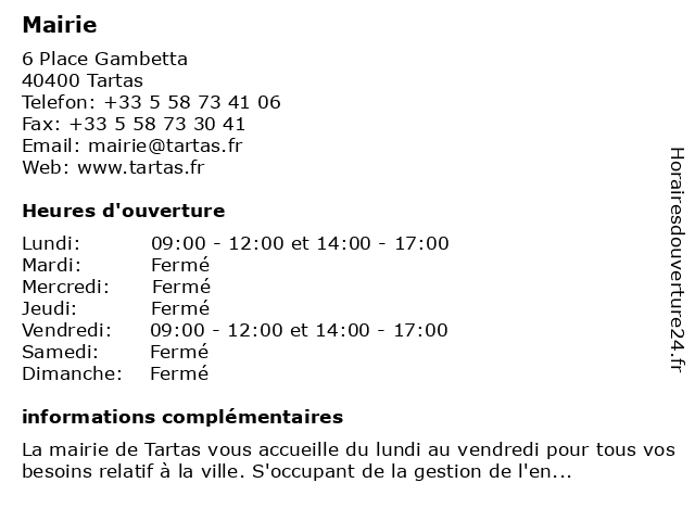 1 Mairie (Distance: 14,97 km) 1 place de la Mairie, 40465 Laluque administration, assoc, associations, aux, bussières, d'information, de, des, dédié, greffe, information, laluque, local, locale, mairie, mission, personnes, point, services, services publics 3 Orpi Agence Place de la Mairie (Distance: 0,04 km) 25 Place Aristide Briand, 40400 Tartas agence, de, la, mairie, orpi, place 4 Mairie de Carcarès-Sainte-Croix (Distance: 1,80 km) 40 rue des Tilleuls, 40400 Carcarès-Sainte-Croix administration, carcarès, commune, croix, de, formalité, information, mairie, sainte 5 Mairie de Lesgor (Distance: 3,19 km) n/a Au Bourg, 40260 Lesgor administration, assoc, associations, aux, bussières, d'information, de, des, dédié, greffe, information, lesgor, local, locale, mairie, mission, personnes, point, services, services publics 6 Mairie de Bégaar (Distance: 3,43 km) - Route du Bourg, 40400 Bégaar administration, assoc public, bégaar, de, mairie |