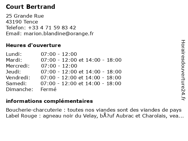 | Samedi | 07:00-12:00 et 14:00-18:00 |